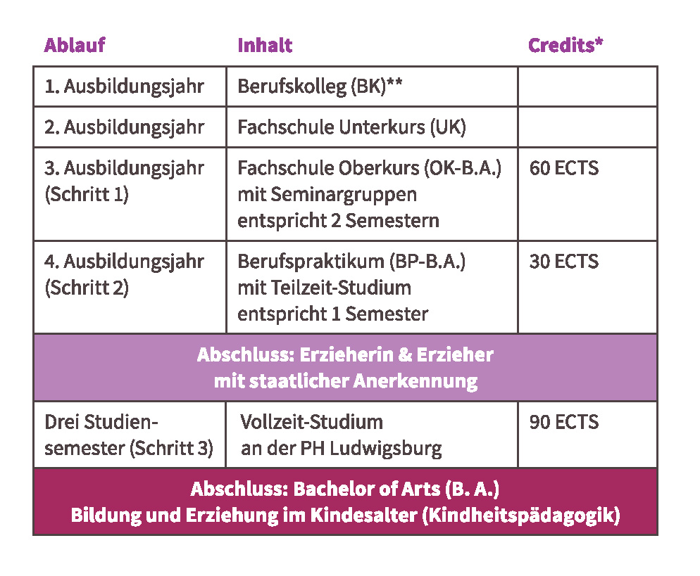 Die Evangelische Fachschule für Sozialpädagogik Schwäbisch Hall bietet in Kooperation mit der Pädagogischen Hochschule (PH) Ludwigsburg einen integrierten Ausbildungsgang an, der mit einer beruflichen Doppelqualifikation abschließt: „Staatlich anerkannte Erzieherin bzw. staatlich anerkannter Erzieher" und gleichzeitig „Bachelor of Arts (B. A.) Bildung und Erziehung im Kindesalter (Kindheitspädagogik)“.