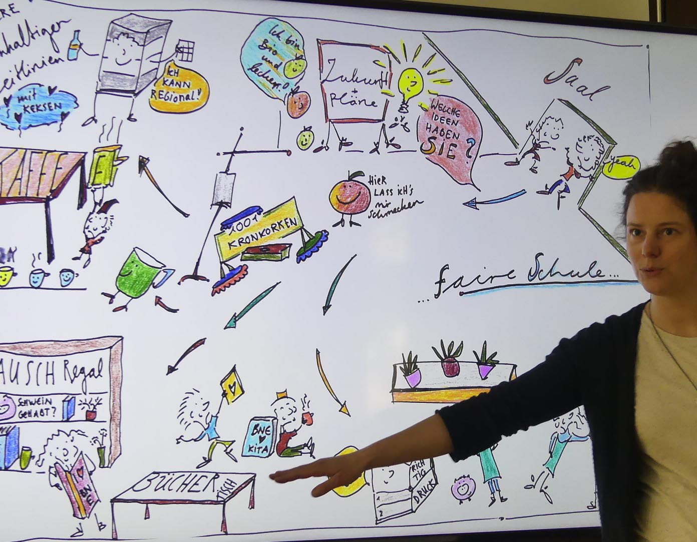 Mareike Erhardt machte die globale Verkettung eindrücklich an dem Beispiel einer jungen Peruanerin deutlich, deren Familie durch die Umstellung auf Fairtrade-Anbau und Handel ihrer Tochter eine Schulbildung und damit Entwicklungschancen ermöglichen konnte. Jeder einzelne, aber auch die Schule als Einrichtung tragen als Konsumierende dazu bei, indem sie nachhaltig und fair handeln. So hat die Arbeitsgruppe Leitlinien entwickelt, die dieses Vorhaben konkretisieren: Die Beschaffung soll möglichst regional, saisonal und aus biologischem Anbau sein. Zudem sollen beispielsweise die Gemeinwohlökonomie unterstützt, Verpackungsmüll vermieden und gebrauchte Güter durch Upcycling weitergebraucht werden. In einer an die offizielle Überreichung anschließenden Stationenpräsentation stellte die Fachschule schließlich vor, was bisher erreicht wurde: Umsetzung nachhaltiger Beschaffungsrichtlinien, Umstellung auf Recyclingpapier im Schulalltag sowie bei Druckerzeugnissen, Förderung von Regionalität, Entwicklung von Upcycling-Projekten für beispielsweise Kunstgestaltung, Sammlung und Spenden von Wertstoffen.